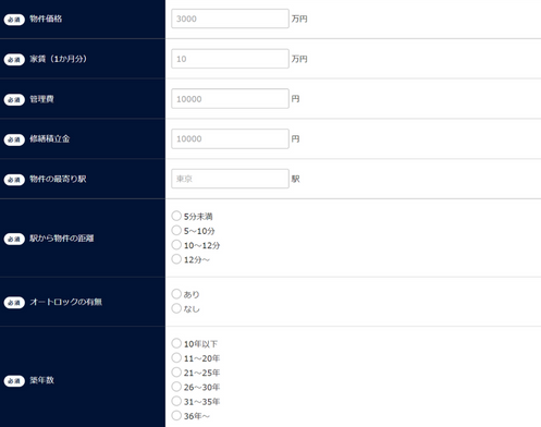 本機能は、物件価格や家賃、管理費、修繕積立金など8つの項目を埋めることで、不動産価格を診断することができます。