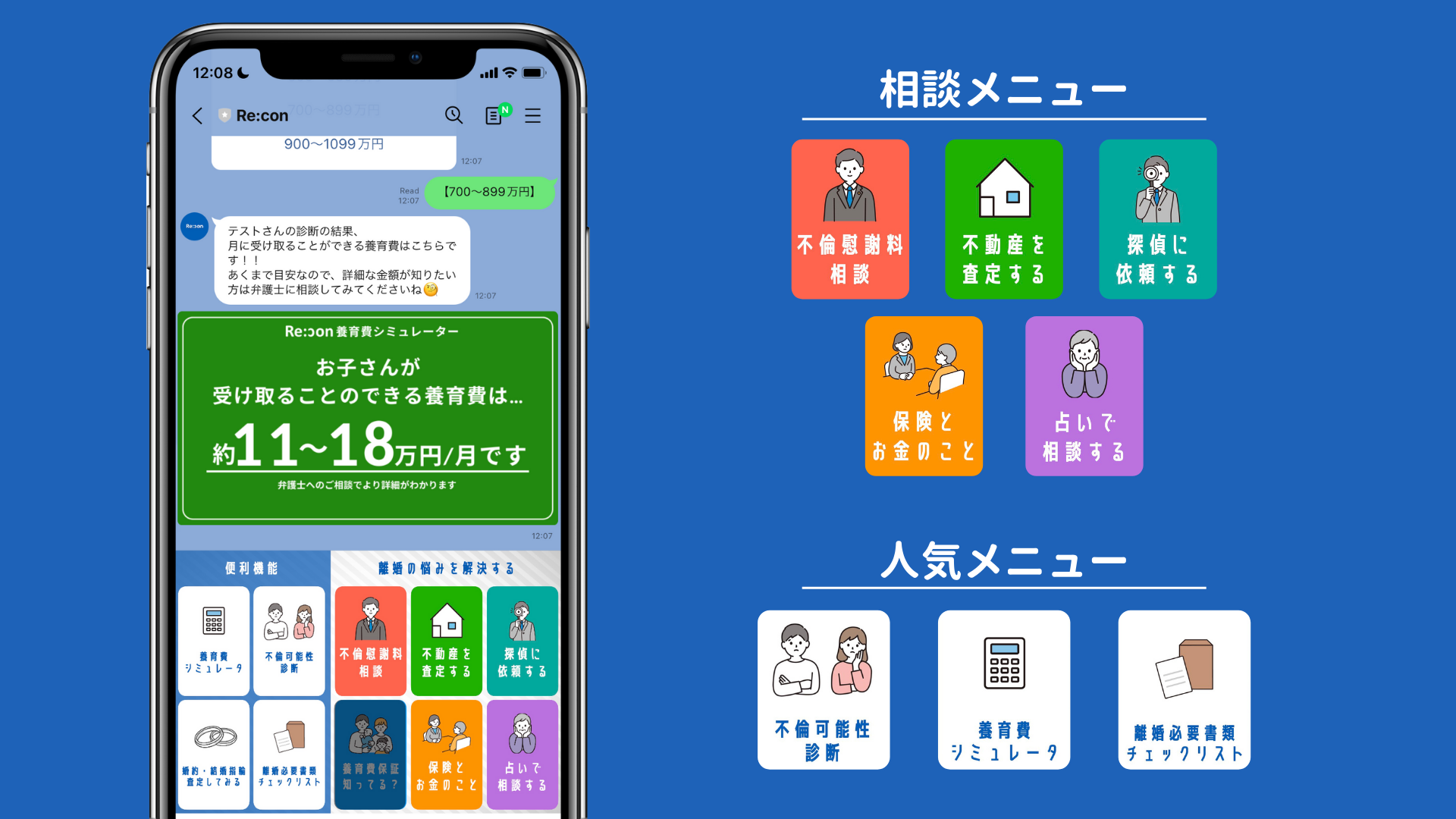 Re:con(リコン)では離婚テックのサービスとして、公式LINEのChatbot機能を活用し、養育費シミュレーターを始めとする離婚の課題解決を手助けするツールを提供しています。