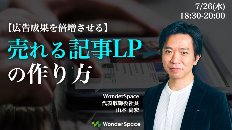 今回は、長年多くの企業様に記事LPを提供してきたパイオニアでもある弊社が記事LPの最新事例から、WonderSpace式のライティング手法について代表自らお話させていただきます。皆様のご参加を心よりお待ちしております。