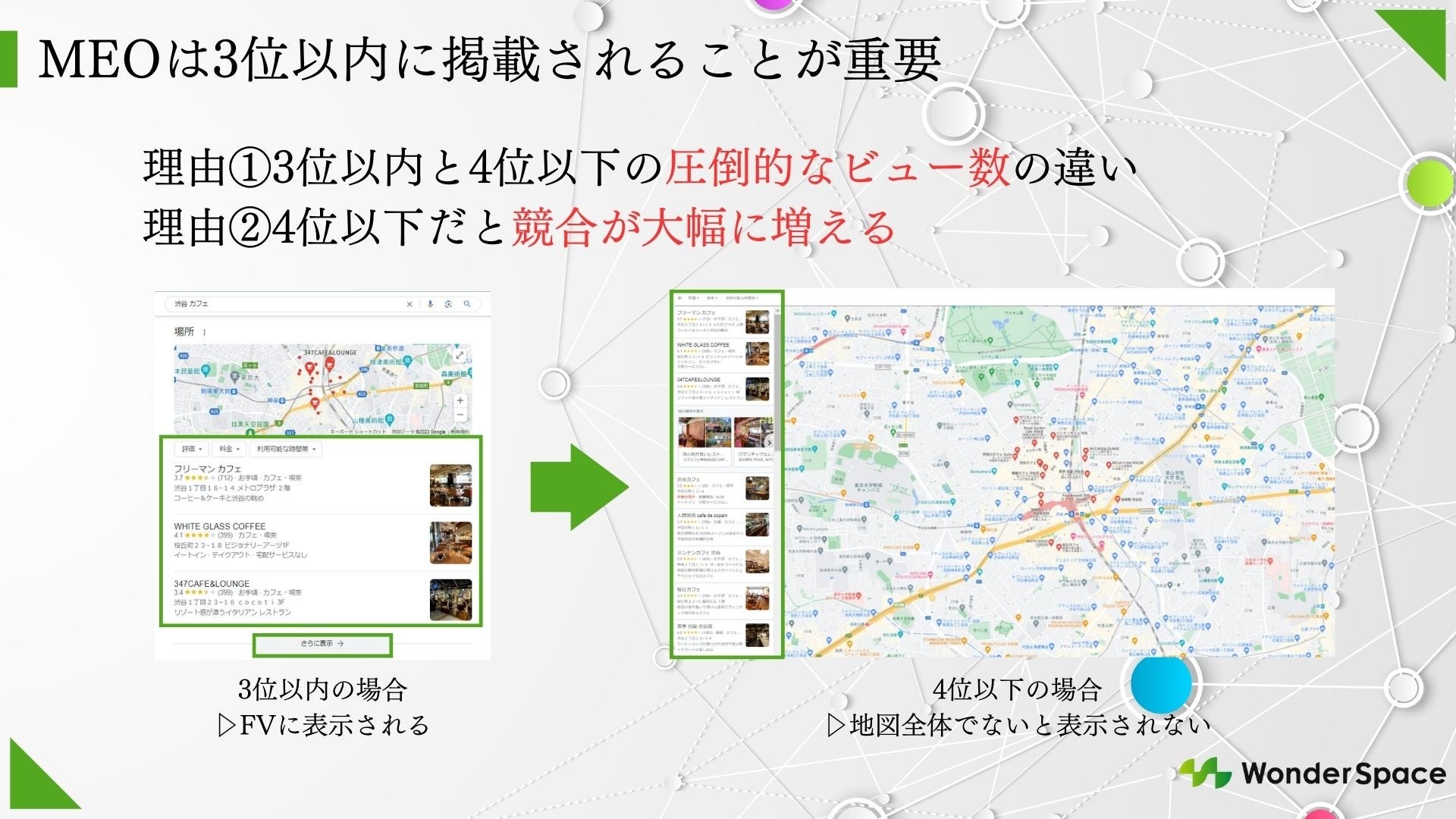 MEOとは、Googleマップでの検索結果において上位表示させることを指し、特に士業事務所などの店舗ビジネスや地域ビジネスにおいては、Webマーケティング上欠かせない重要施策となります。
