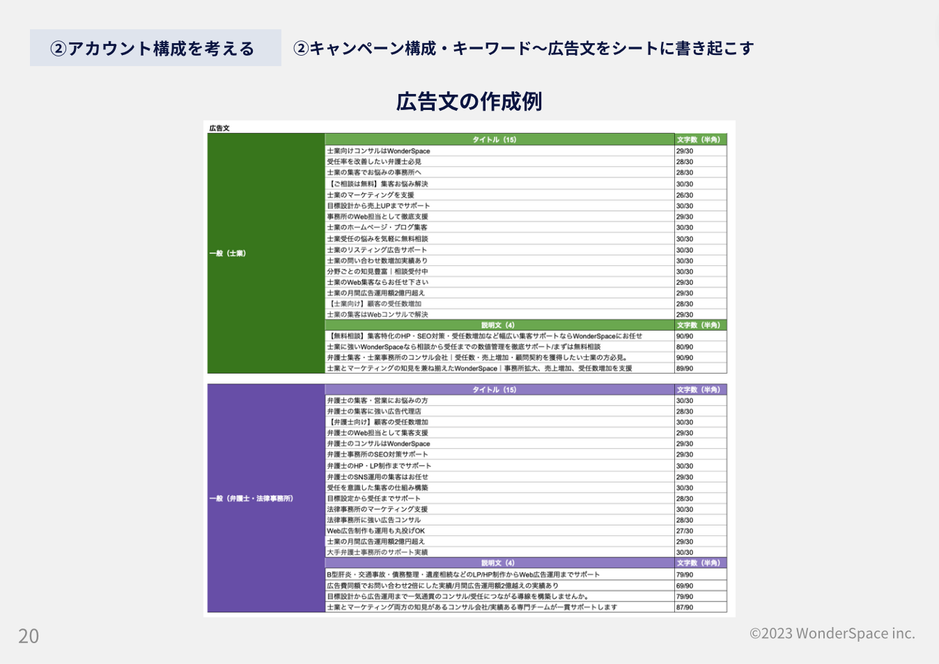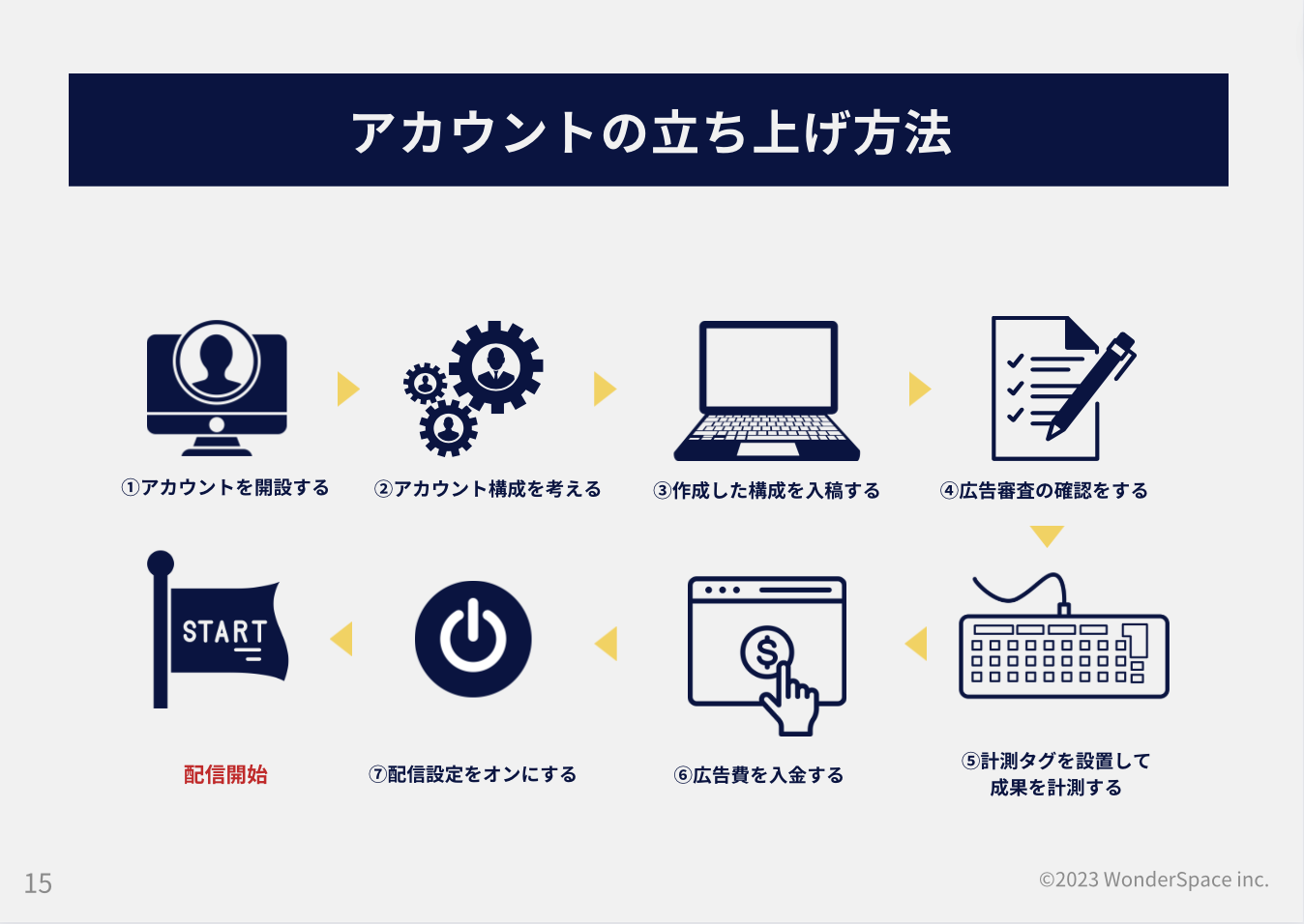 広告アカウントの作成方法やキャンペーン構造、キーワードの選定方法、効果的な広告文の作成手法など、